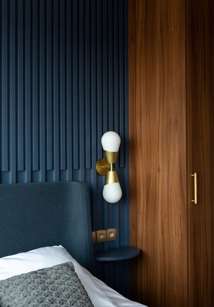 📌 Exemple : Une chambre aux murs bleu marine, avec du linge de lit blanc et des luminaires en laiton pour un effet chic et douillet.